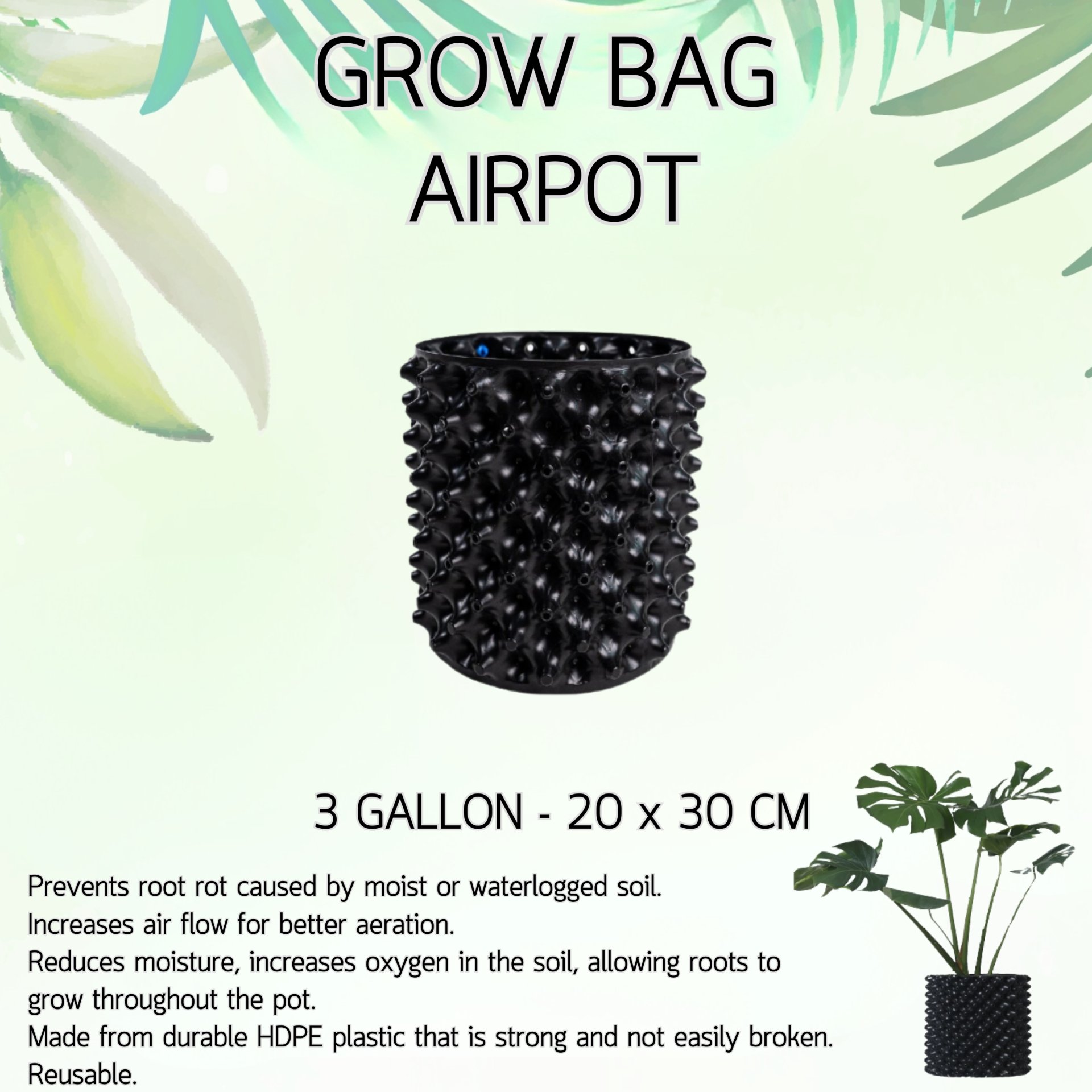 ช่วยทำให้ต้นไม้ที่ปลูกสัมผัสกับออกซิเจนได้มากขึ้น รากแผ่กระจายได้ทั่วถึง ลดการเกิดปัญหารากเน่าและเชื้อรา เพิ่มจำนวนราก ทำให้ต้นไม้สามารถดูดซึมสามารถอาหารได้มากขึ้น วัสดุที่ใช้ทำจากพลาสติกรีไซเคิล HDPE เป็นมิตรต่อสิ่งแวดล้อม ทนทานใช้งานได้นาน ดีต่อพืชและต้นไม้ทุกชนิด เช่น มะเขือเทศ สตรอเบอรรี่ สมุนไพร ดอกไม้ ไม้ดอก ไม้ใบ ฯลฯ