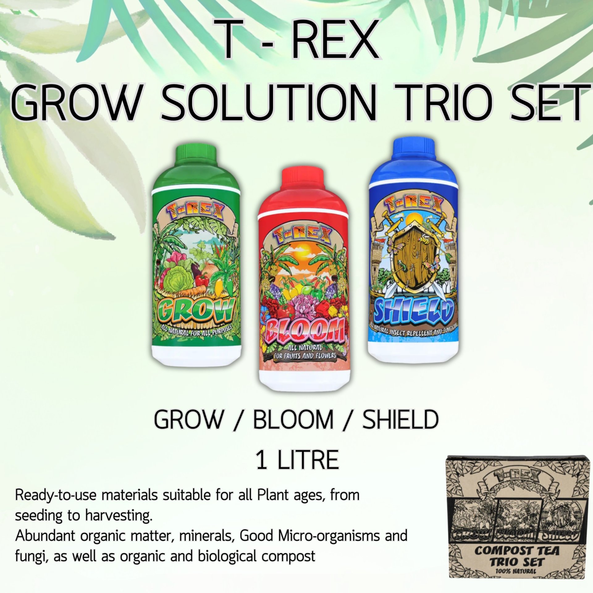 T-REX Trio Set น้ำหมักสูตรเฉพาะทั้ง 3 ที่จะมาช่วยให้การปลูกพืชอินทรีย์นั้นง่ายและสบายยิ่งขึ้น ด้วยรูปแบบที่สะดวกต่อการใช้งาน ครบถ้วนทุกความต้องการของพืชและดิน ไม่ว่าจะเป็นพืชผักสวนครัวหรือพืชสมุนไพรทางเลือก