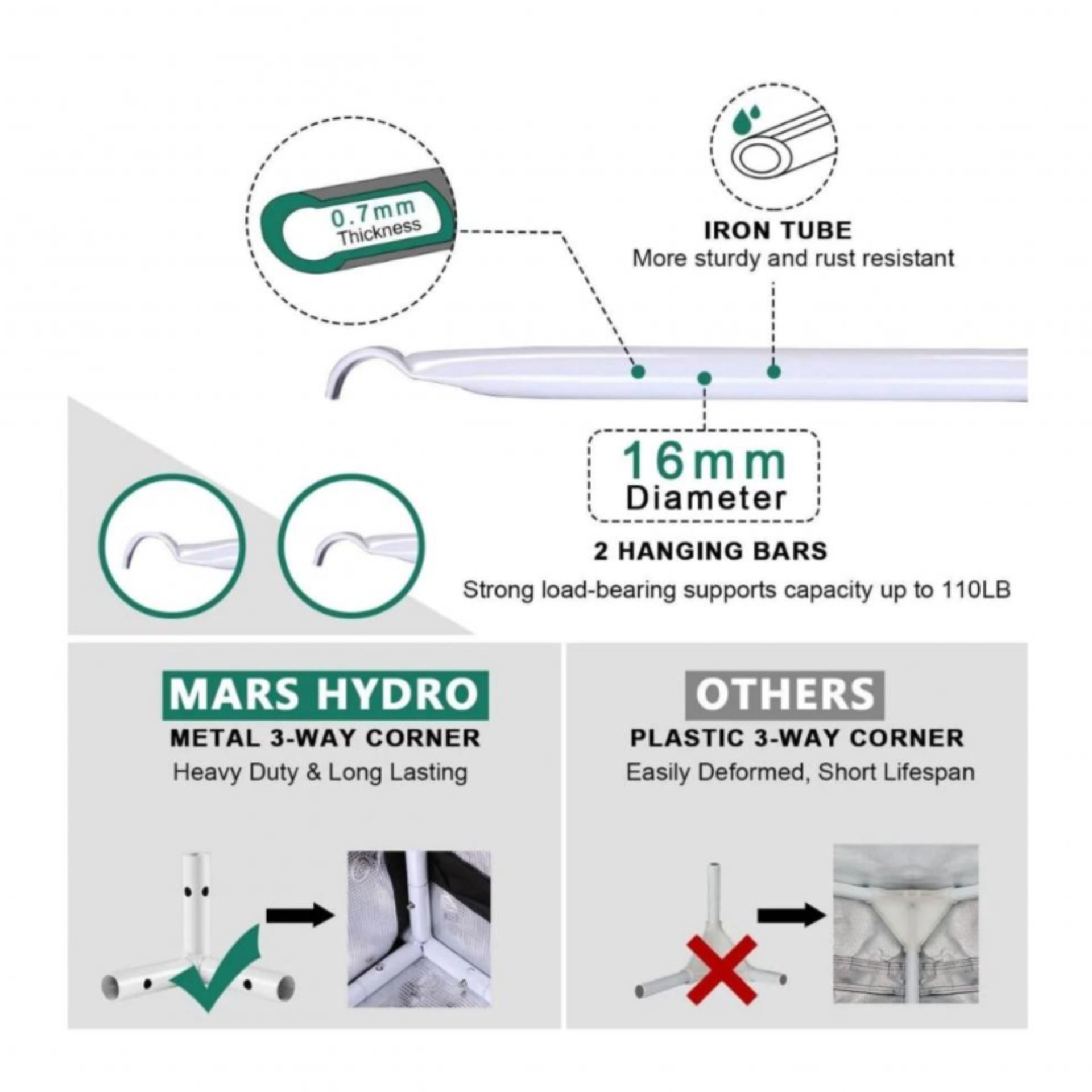 Mars Hydro grow tents use 1680D thick canvas, heavy-duty steel poles, and SBS zippers, creating a non-toxic human work environment while using high-quality materials and locking all light in. Easy observation view window, removable floor tray, and a tool bag to help grow the plants indoors more conveniently.