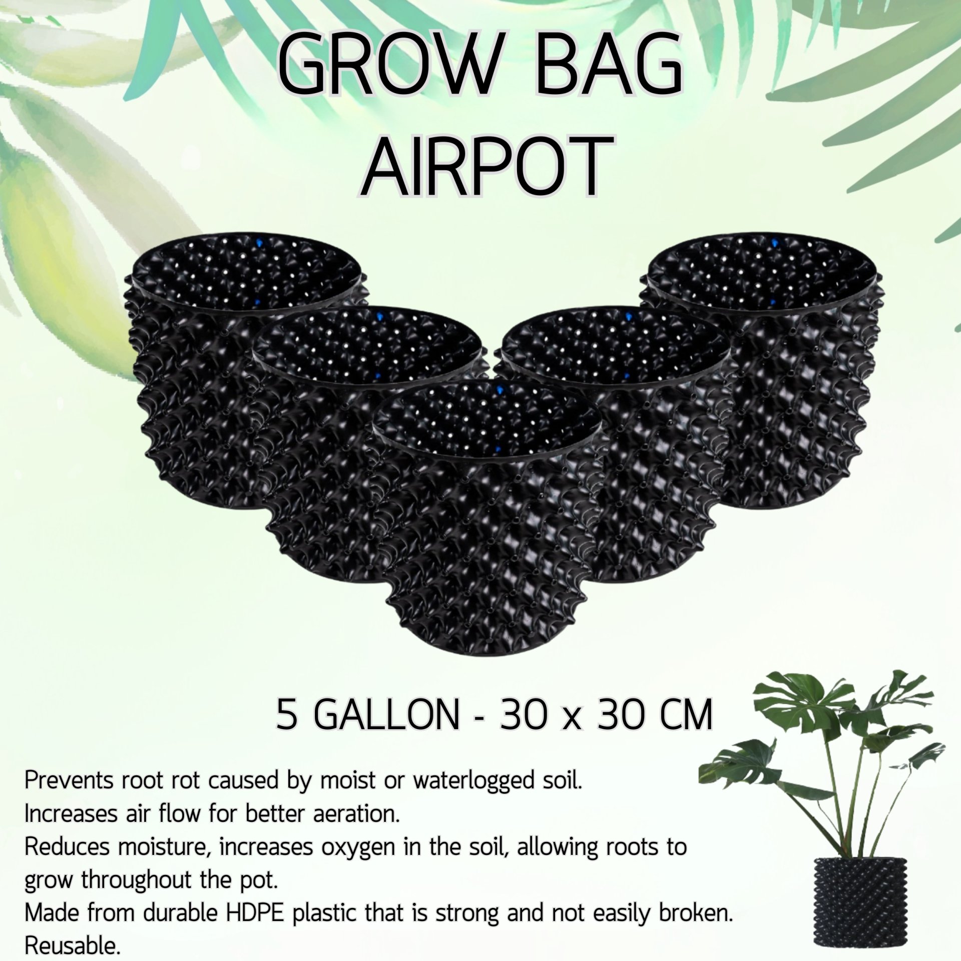 ช่วยทำให้ต้นไม้ที่ปลูกสัมผัสกับออกซิเจนได้มากขึ้น รากแผ่กระจายได้ทั่วถึง ลดการเกิดปัญหารากเน่าและเชื้อรา เพิ่มจำนวนราก ทำให้ต้นไม้สามารถดูดซึมสามารถอาหารได้มากขึ้น วัสดุที่ใช้ทำจากพลาสติกรีไซเคิล HDPE เป็นมิตรต่อสิ่งแวดล้อม ทนทานใช้งานได้นาน ดีต่อพืชและต้นไม้ทุกชนิด เช่น มะเขือเทศ สตรอเบอรรี่ สมุนไพร ดอกไม้ ไม้ดอก ไม้ใบ ฯลฯ