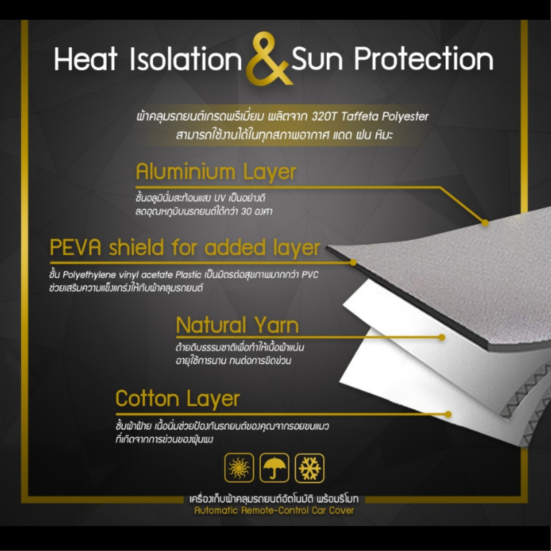 3. เนื้อผ้าคลุมอย่างดี นิ่ม ไม่ทำให้ผิวรถยนต์ถลอกหรือเป็นรอย ลดอุณหภูมิในรถยนต์ของคุณมากกว่า 30 องศา หากมีเหตุจำเป็นต้องเก็บผ้าคลุมตอนฝนตก แนะนำให้หาเวลาเปิดผ้าคลุมในผึ่งแห้งเมื่อมีโอกาส เพื่อรักษาอายุการใช้งานของผ้าคลุมไม่ให้เป็นราหรืออับชื้น