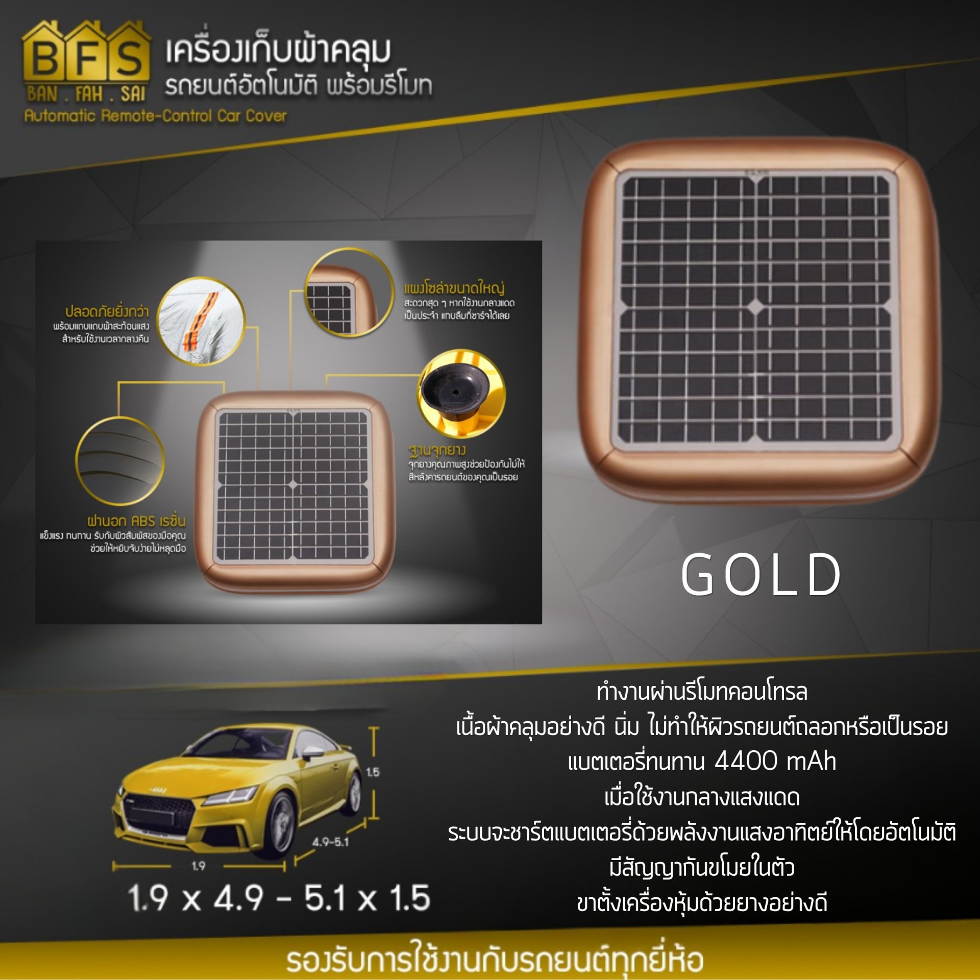 รูปทรงโดดเด่น พับเข้า-ออกด้วยรีโมท พกพาสะดวกไม่กินเนื้อที่ สามารถถอดแบตเตอร์รี่ไปชาร์จแยกได้ รองรับพลังงานแสงอาทิตย์โดย Solar Cell แผงใหญ่บนกลางเครื่อง หากใช้กลางแดดบ่อย ๆ แทบไม่ต้องใช้ที่ชาร์จได้เลย มีระบบกันขโมยส่งเสียงดังหากเครื่องถูกโยกย้ายเมื่อกางเสร็จแล้ว ฟรี! มีสายรัดกันขโมยในชุด ขาตั้งผลิตจากยางอย่างดีป้องกันหลังคารถยนต์ของคุณเป็นรอย